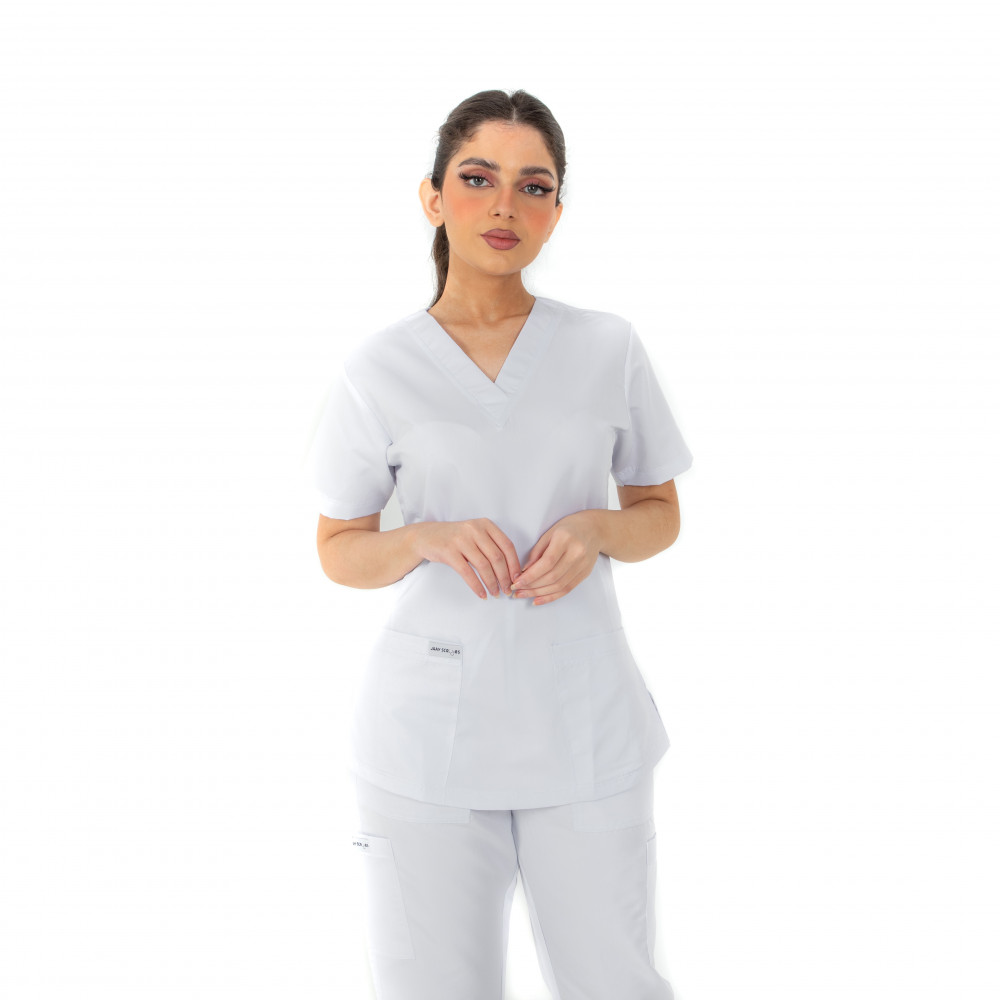 سكراب ابيض بقصة مقوسه من الجانبينقميص بفتحة V و جيبينبنطال بقصه واسعه من الأسفلتحكم سهل بالحزامسهل العناية والاهتمام